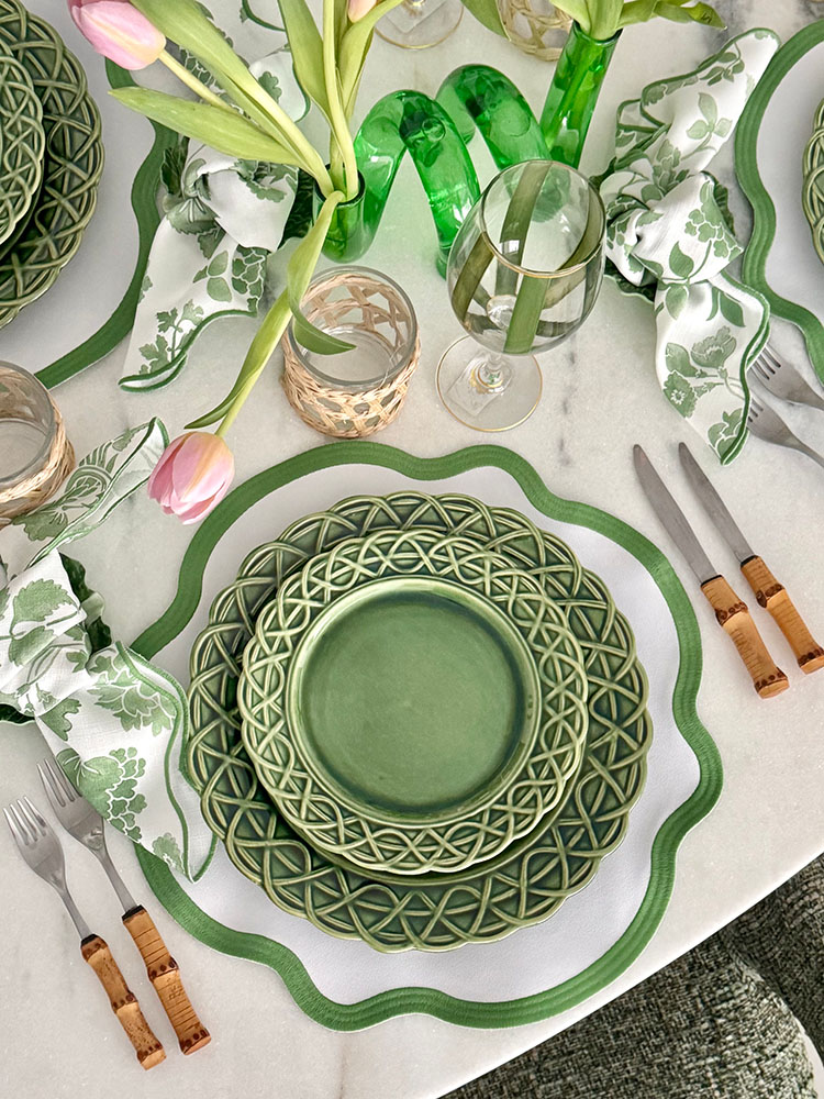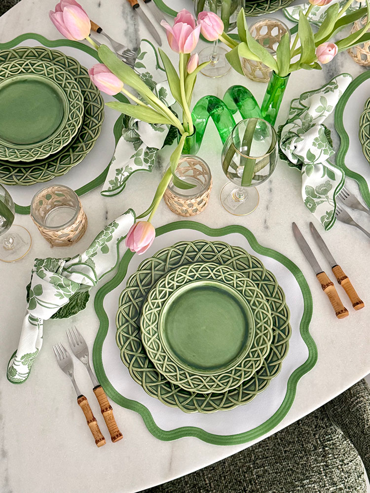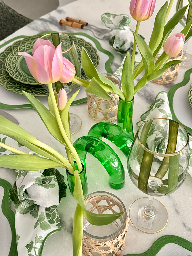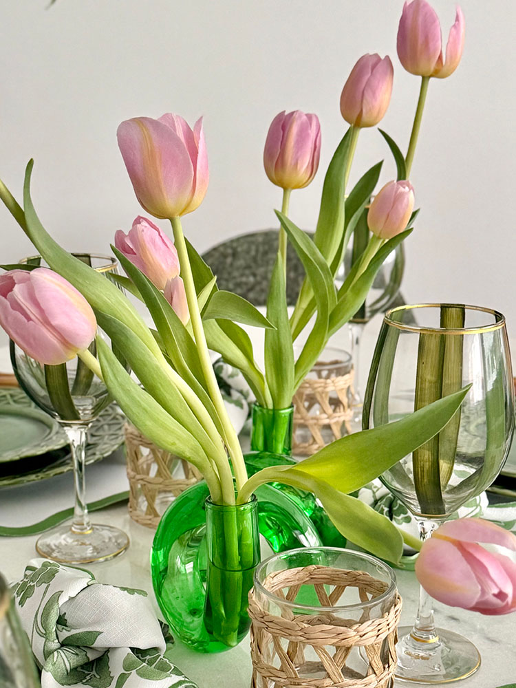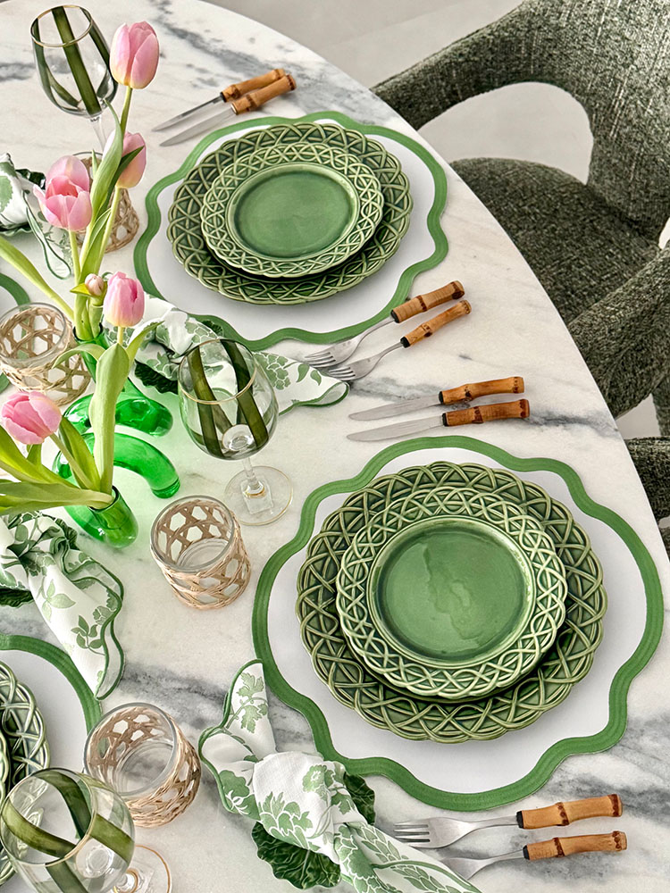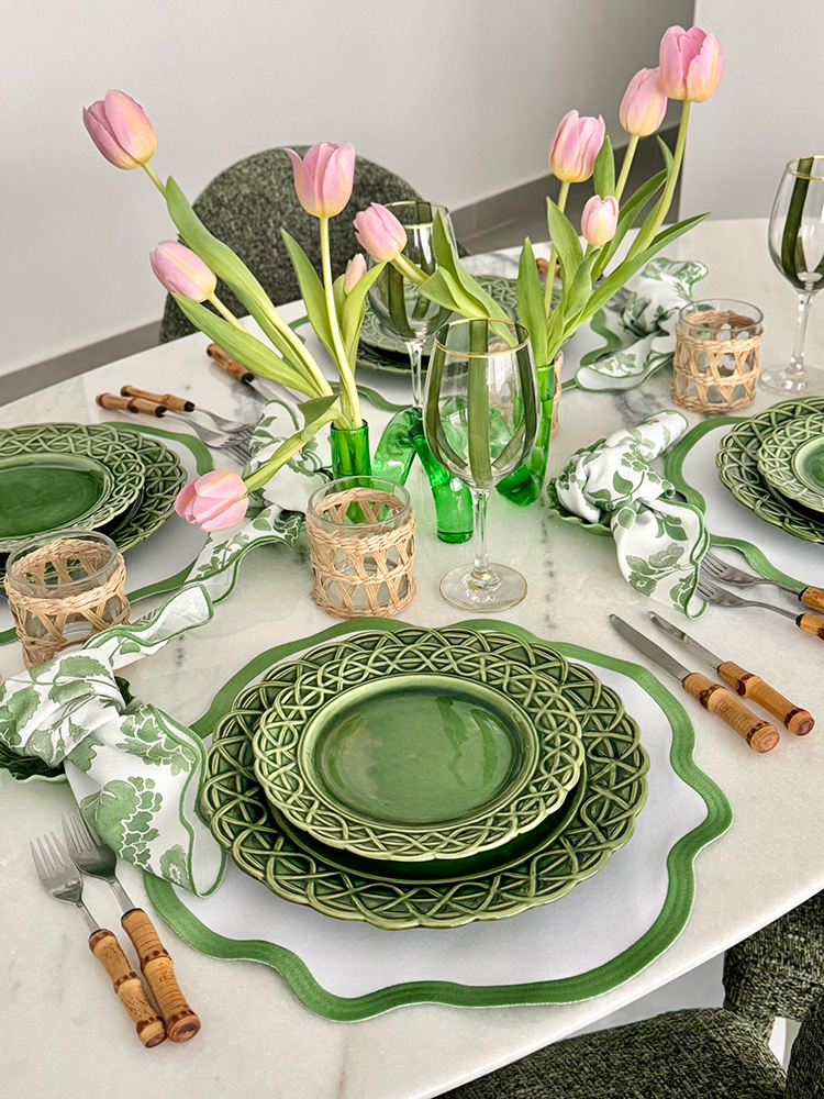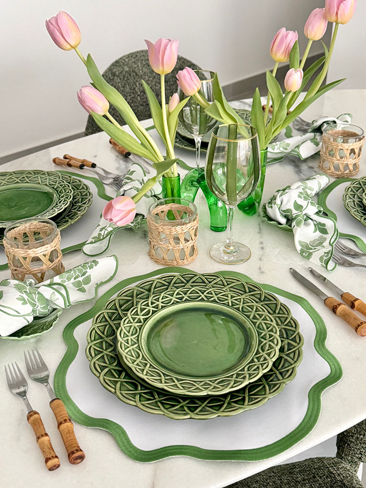- Aposte em arranjos leves com flores e folhas verdes, que conversam com as peças da linha.